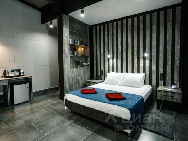 Просторный номер в современном стиле с высокими потолками с зоной отдыха в серо-синей цветовой гамме.