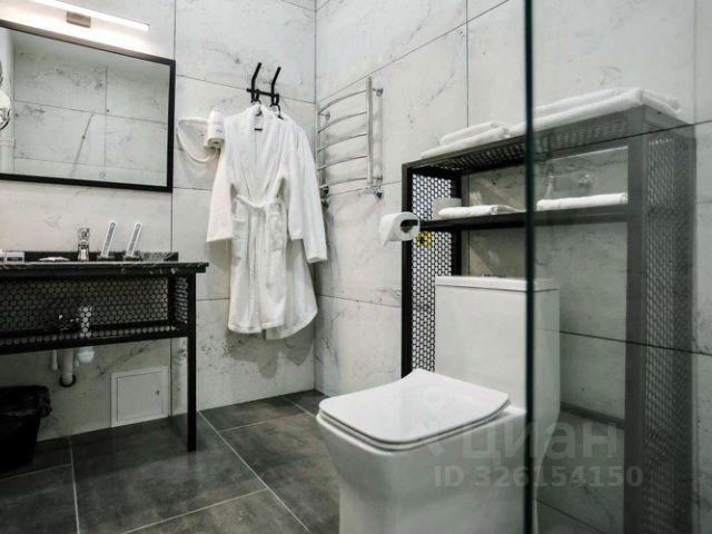 Ванная комната: душ, санузел, раковина, зеркало с подсветкой, зубная щетка, зубная паста, шампунь, мыло, гель для душа, лосьон для тела, салфетки, туалетная бумага, халаты, банные полотенца, тапочки, шапочка для душа.