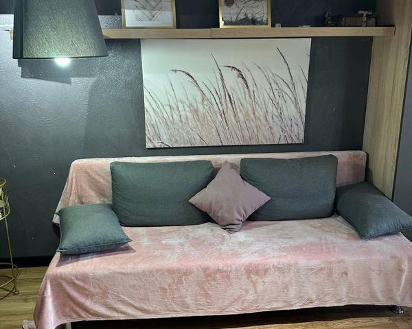 Квартира 43,4 квадрата, без балкона. Кухня-гостиная 21 кв с высоким большим окном, кухонный гарнитур, бытовая техника (холодильник, стиральная машина, электрическая плита, микроволновая печь, чайник, сплит-система 9ка), обеденная зона, удобный раскладной диван спальное место 140*200, комод для хранения вещей.